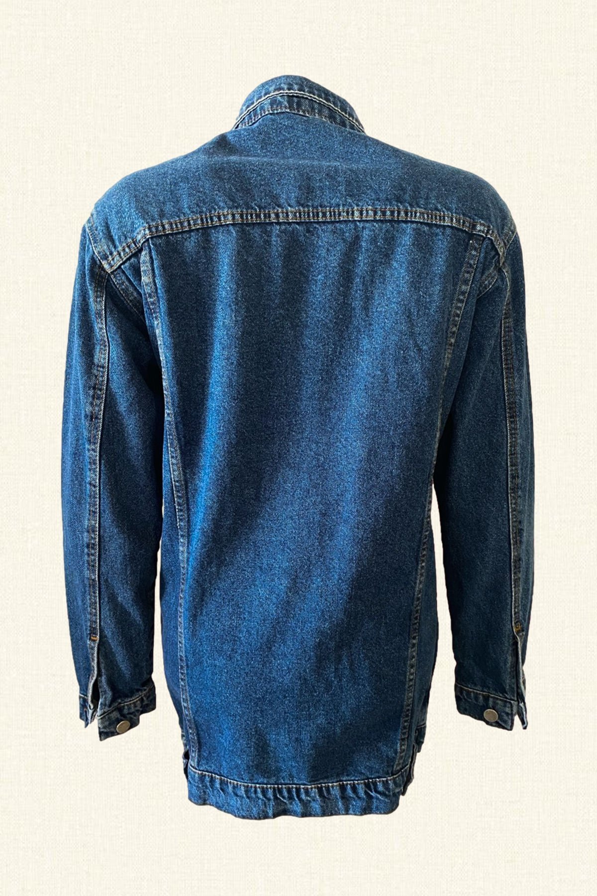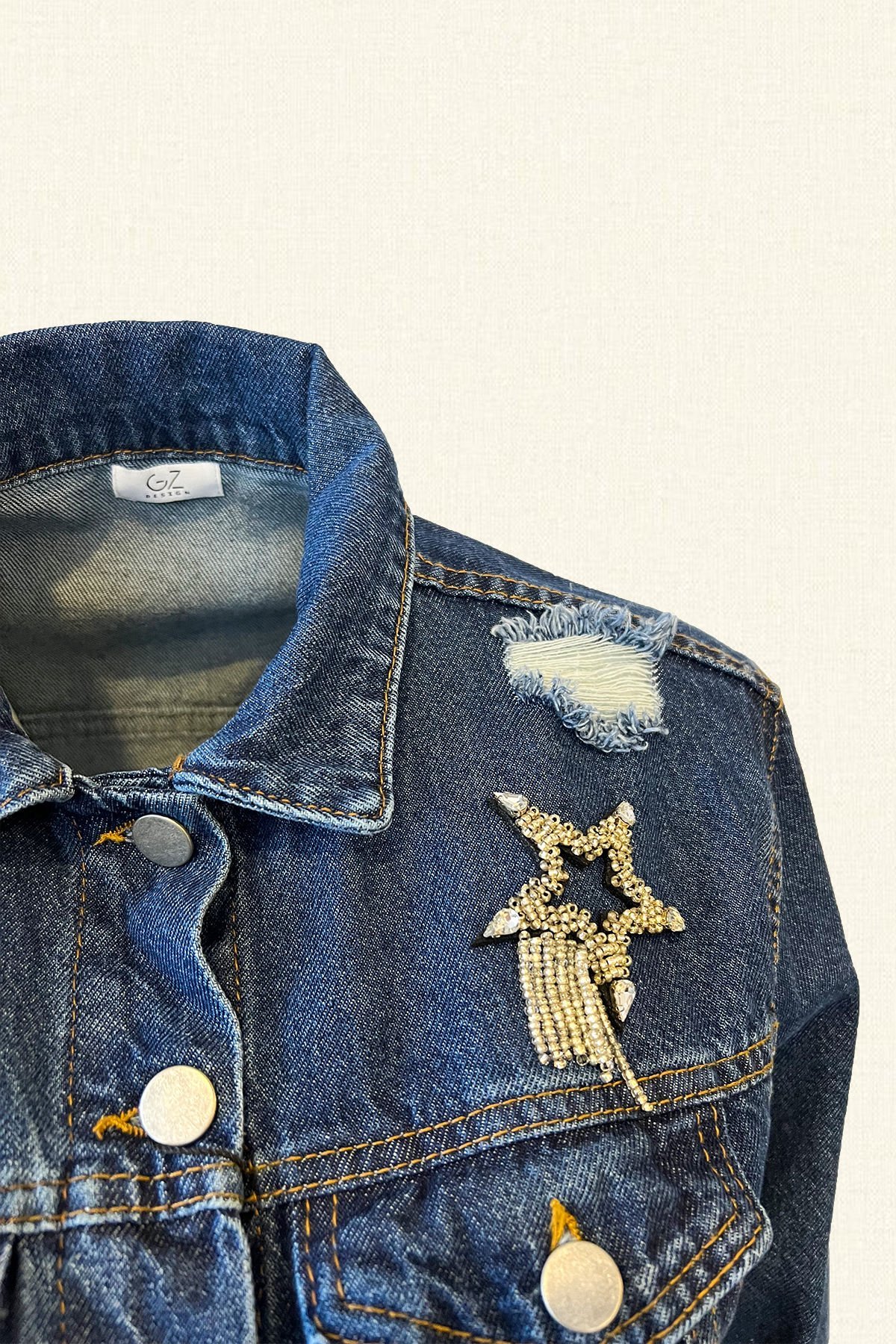 Önü kristal taşlı yıldız işlemeli, uzun model, oversize kalıpta denim ceket.